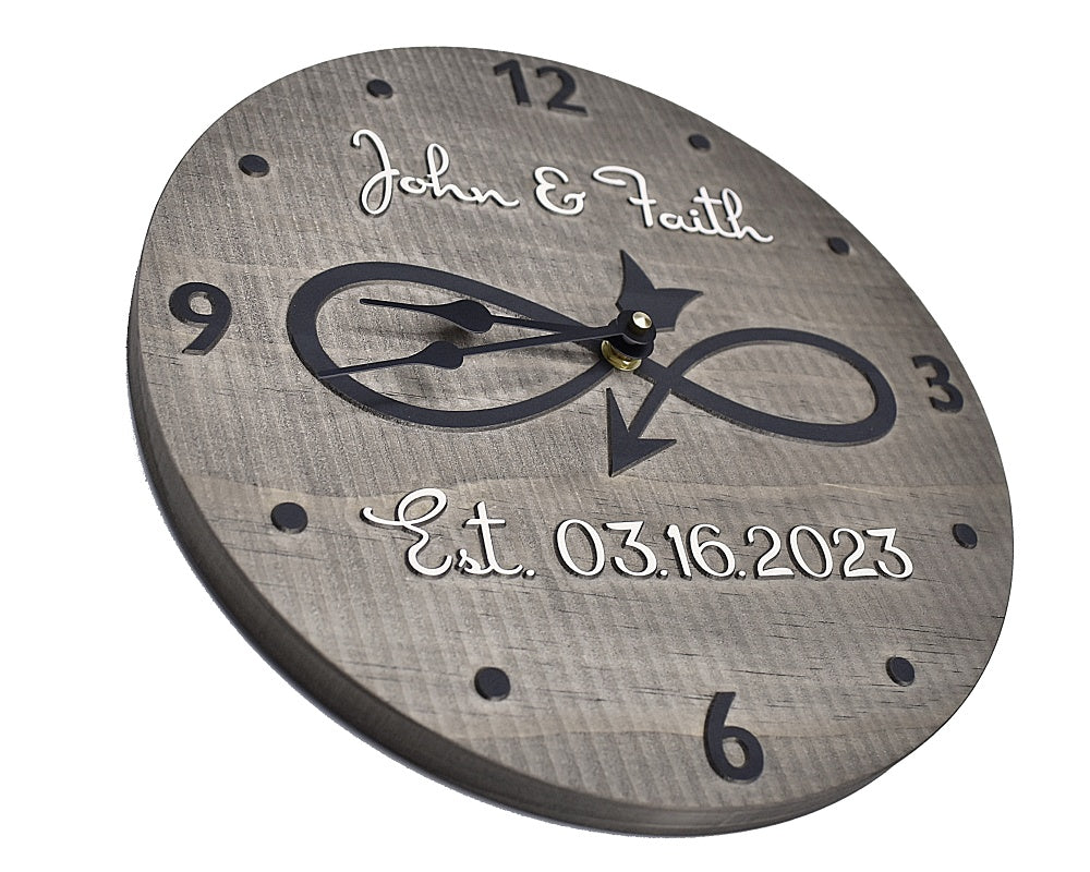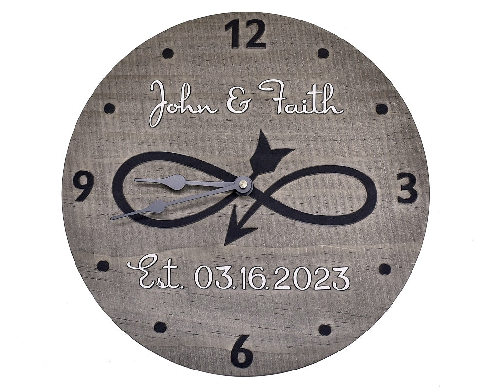 Features infinity arrow symbol in the center of the clock with the couple's first names above it, and the established year or wedding date below it.